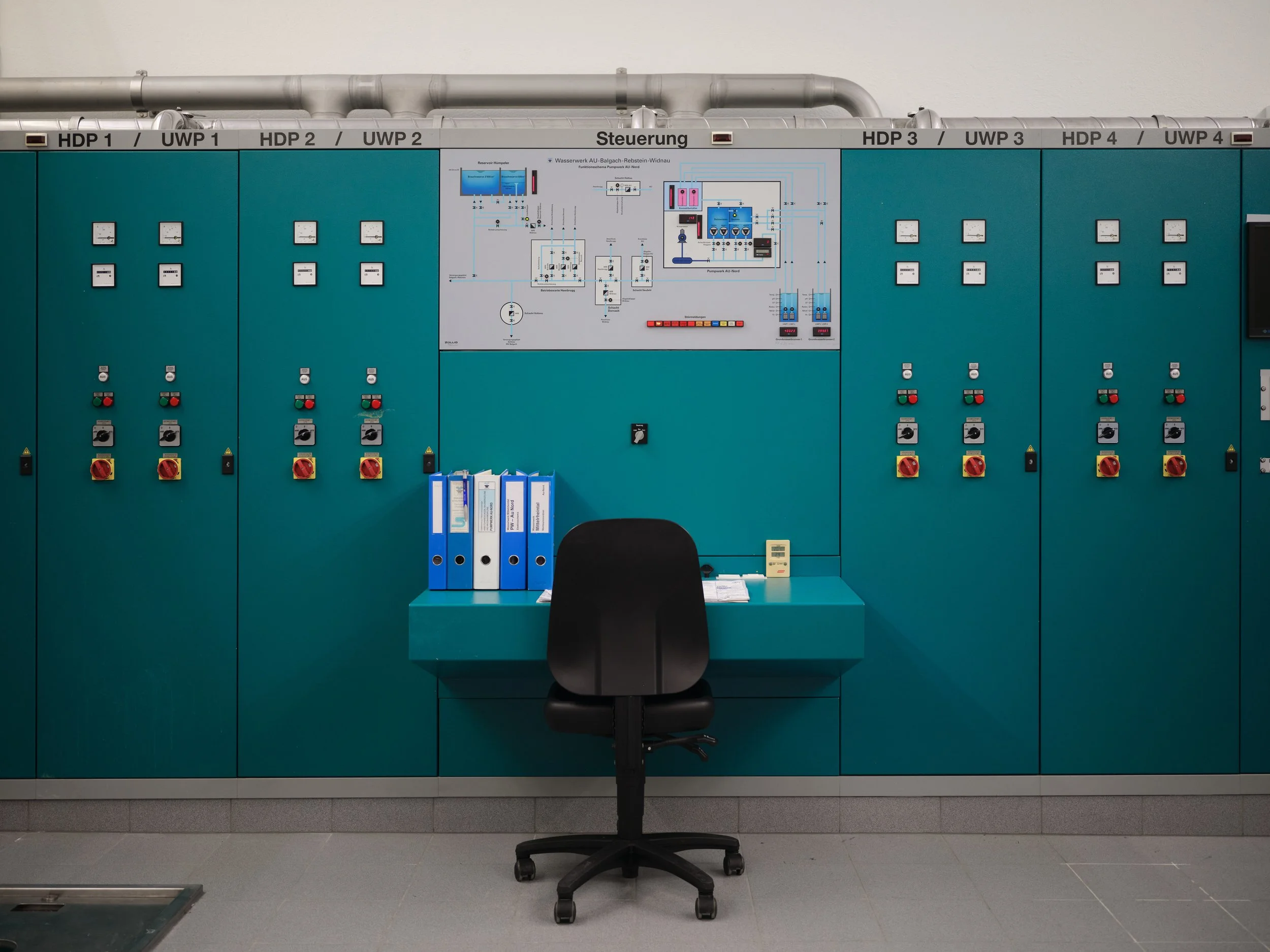 Bellow: Control center of the drinking water pumping station in Au, for WOZ Die Wochenzeitung